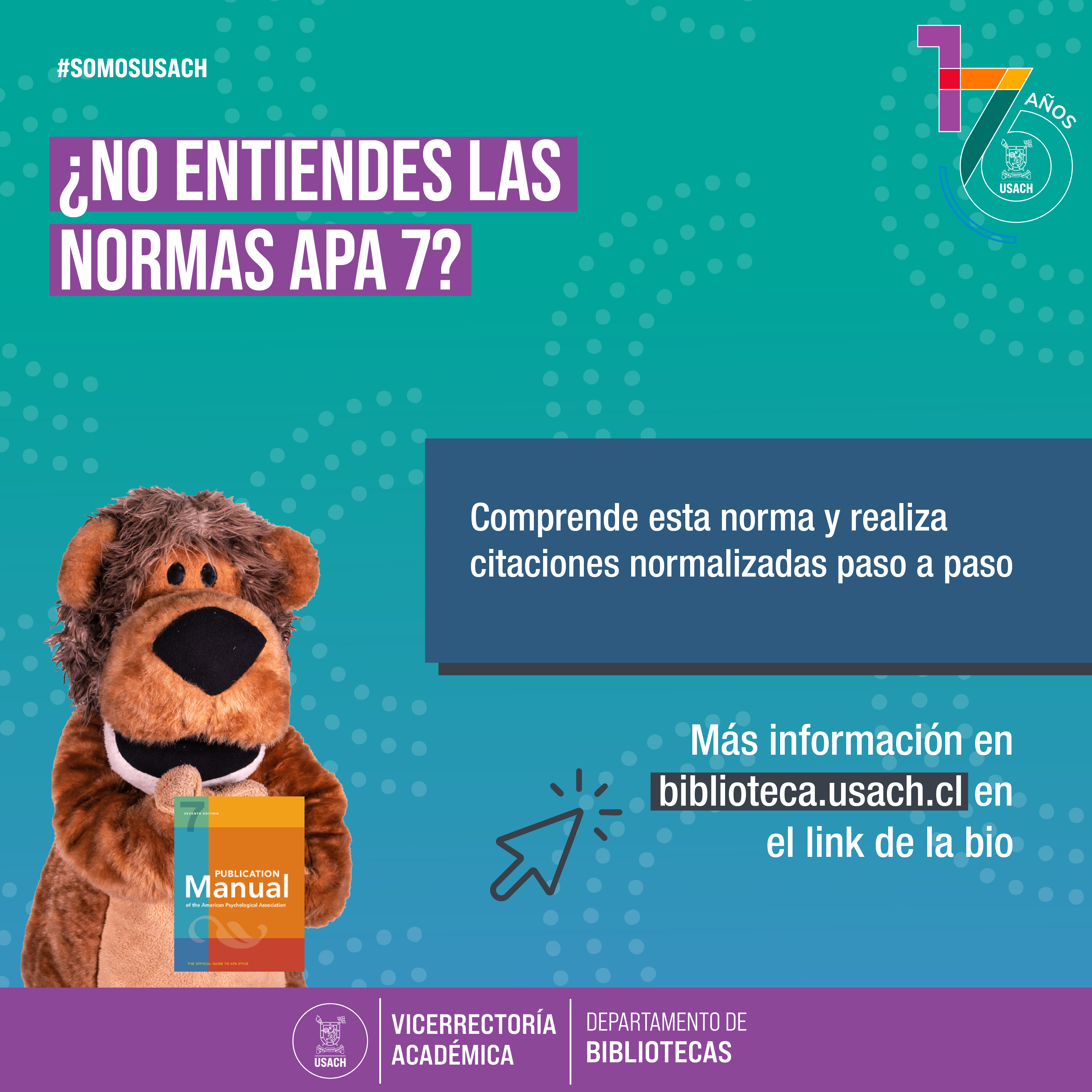 El Departamento de Bibliotecas de la Universidad de Santiago de Chile (Usach), en su compromiso constante con la formación académica de calidad, presenta a la comunidad universitaria su nueva herramienta de autoaprendizaje: la LibGuide “Normas APA 7: Cómo Citar y Referenciar Correctamente”. Disponible en la sección Plataforma de Autoaprendizaje del sitio web del Departamento, esta guía autoinstructiva entrega contenidos claros, actualizados y paso a paso sobre el uso correcto del estilo de citación APA en su séptima edición. La iniciativa está orientada a estudiantes, académicos y funcionarios, con el objetivo de fortalecer la calidad de sus escritos académicos y promover una cultura de buenas prácticas en la investigación y producción de conocimiento. El correcto uso de las normas APA no solo asegura la integridad académica, sino que también mejora la presentación, coherencia y credibilidad de los trabajos. Citar adecuadamente es una práctica fundamental que permite dar el debido crédito a las fuentes, evita el plagio y respalda los argumentos presentados en un texto. “La LibGuide busca ser una herramienta accesible y amigable para quienes desean aprender o reforzar el uso de APA 7. Con ella, promovemos el autoaprendizaje y apoyamos directamente la producción académica de calidad en nuestra universidad”, señala Gabriela Sánchez Arriola, Bibliotecaria coordinadora del Área de Recursos Digitales del Departamento de Bibliotecas. Quienes deseen comenzar a utilizar la guía pueden acceder directamente en el siguiente enlace: https://usach.libguides.com/c.php?g=1434101